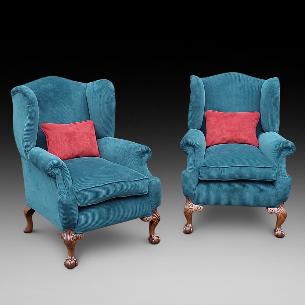 Pair of Late 19thC Chippendale Revival Wing Arm Chairs with blue Corduroy upholstery on ball and claw cabriole legs- 31"w x 36"d x 44"h (21" to the seat)