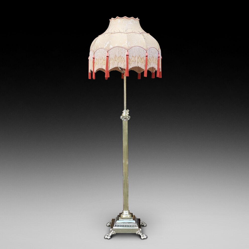having adjustable column with butterfly clip, Doric capital and square stepped base on lion paw feet - converted to electric - 22"diam x adjustable height - The lampshade(s) are newly handmade silks by the same maker as provides the shades for Downton Abbey - all lights and lamps have been rewired with authentic corded flex, fitted with either foot switch or finger clicker switch and are Pat tested